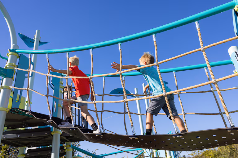 Walk the line! The Slack Line brings ground-level balance challenges to any PlayBoosterยฎ playstructure, inviting kids ages 5 to 12 to test their coordination and core strength while providing a cable to hold as they traverse. Multiple lengths are available to enable multi-dimensional play in previously underutilized spaces. The flexible design means there’s no single “right way” to cross, encouraging creative problem-solving and building confidence with every successful journey.