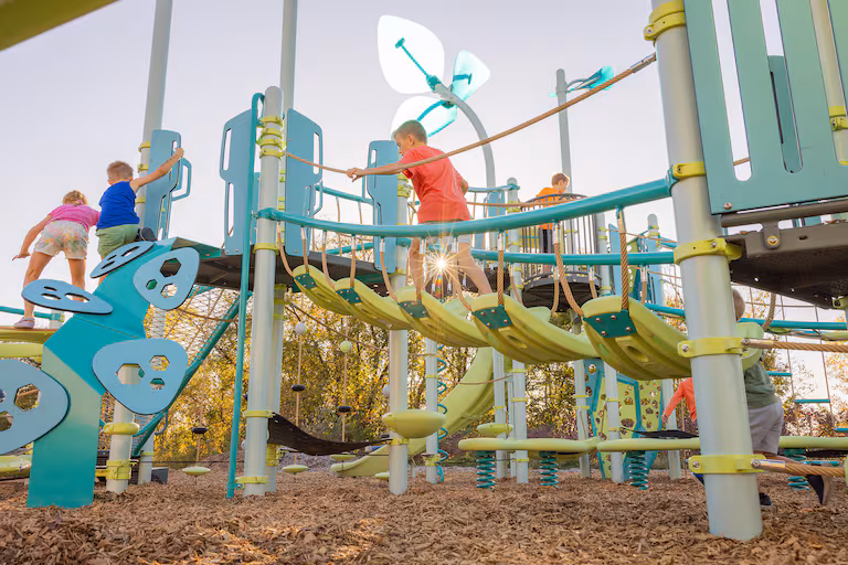 The BeltSwoopโข Climber takes playground climbing to new heights with its dynamic belting design that moves and sways with every step. As children of all abilities navigate across the flowing belt pathway, the gentle give-and-take motion builds core strength and spatial awareness while creating an exhilarating sensory experience. The BeltSwoopโข transforms the journey between play zones into an adventure all its own!